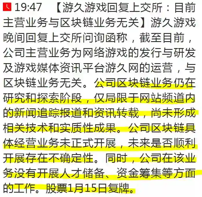 游久游戏被问话,很多公司赶紧发布公告澄清区块链传闻,其中就包括了前期多只涨停的区块链概念股。