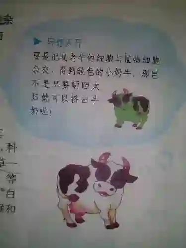 要是把老牛细胞与植物细胞杂交,得到绿色的小奶牛,那岂不是只要晒晒太阳就可以挤出牛奶啦!