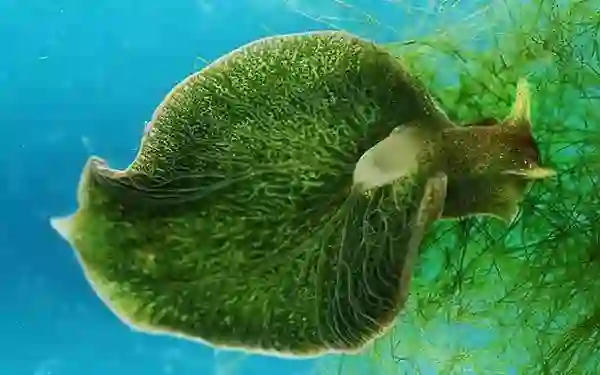 实际上,抛开那些和藻类共生的动物不算,世界上确实存在一种能够光合作用的动物,那就是绿叶海天牛Elysia chlorotica(咦?名字里居然还带个牛字),这是一种海里的蛞蝓,把它当成一种海里的无壳蜗牛也不算太错,这种动物能力相当逆天,它可以从食用的藻类当中窃取叶绿体和光合基因来帮助自己进行光合作用。