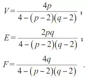 古人虽然感觉到只有五种柏拉图多面体,但却没有证明。关于这个问题,基于欧拉多面体公式,可以得出一个非常简单的证明。注意观察正多面体的边,每一个边都是由两个顶点规定了的,且每一个边又都是由两个面所规定了的:“两个顶点连一个边,两个面交于一个边。”这样,假设正多面体的小面是p-边形(p>2),每个顶点连接着q 条边(q>2),则有pF=2E=qV。由欧拉公式V-E+F=2,可联立求解得