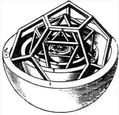 如果一个凸多面体的小面是全等的规则多边形,则称为规则多面体。这样的规则凸多面体只有五种,即正四面体(tetrahedron,小面为三角形),正六面体(cube,立方体,小面为正方形),正八面体(octahedron, 小面为三角形), 正十二面体(dodecahedron,小面为五边形) 和正二十面体(icosahedron,小面为三角形),见图2。柏拉图时期人们就知道这五种规则多面体。在《蒂迈欧》一书中,柏拉图猜测地上的四种元素风、火、水和土以及天上的quintessence (即第五种存在)就分别对应这五种形状,因此这五种规则多面体又称为柏拉图多面体(Platonic solids)。具体地,正四面体对应火,正六面体对应土,正八面体对应气,正二十面体对应水, 而正十二面体对应quintessence 或者宇宙。整个天体为球体。后来,开普勒用它们构造宇宙的模型(图3)。柏拉图和开普勒这类人之所以是智者,就在于他们模糊的认识在后来被发现包含着最深刻的道理。这些多面体由球脱胎而来,数学上这些几何体的对称群是球对称群SO(3)的子群,而物理上一个球形液滴冷却后结晶,即发生对称性破缺,留下了对称性较低的固体颗粒。据信人类在四千年前就制作出这五种规则多面体了(图4)。不过,远古人类为什么要用石头制作正多(曲)面体,十分费解。