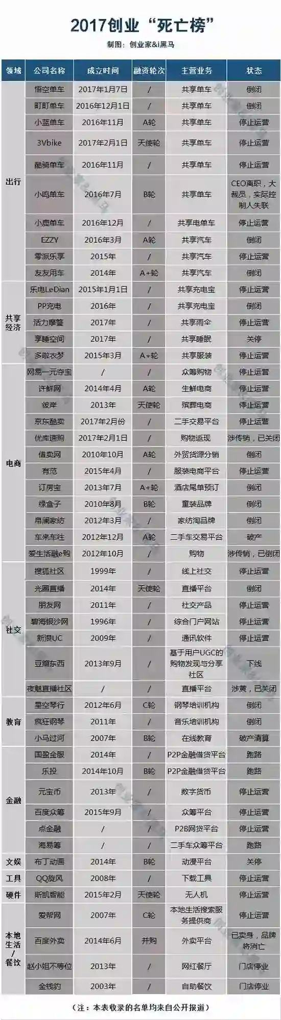 近日,创业家&i黑马盘点了这一年中未能活下来的创业项目,称作“创业死亡榜”。