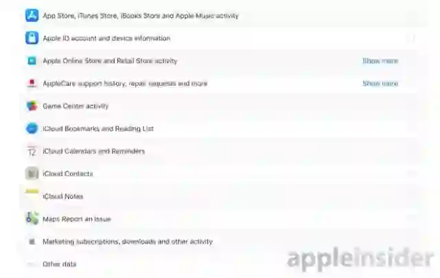 其中最主要的功能是“获取你的数据备份”,包括了大量的用户个人信息,比如购买和应用的下载历史、以及用户允许储存在苹果服务上的数据。可供下载的数据类型包括Apple ID和设备数据、在线及苹果零售店活动、AppleCare支持历史和请求、游戏中心和苹果在线商店各种相关的活动。