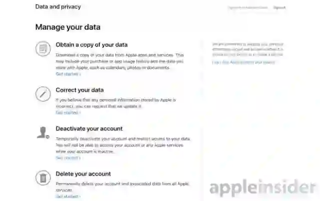 苹果该项数据与隐私网站计划最初在今年3月公布,本周三正式率先在欧洲地区上线。对所有想要获取自己被上传到苹果服务器信息的用户来说,这个网站提供了一站式的服务,可以允许iCloud和苹果其它服务的用户管理自己的个人数据,包括修改或者直接从苹果的服务器中删除。