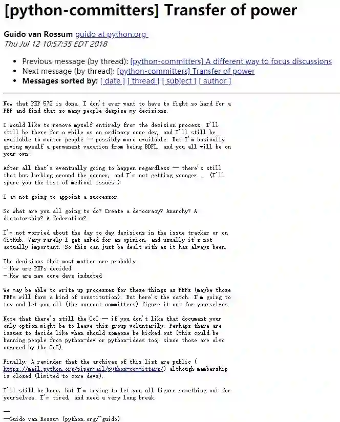 过去一段时间,Guido一直在为PEP572的通过而努力,然而此过程并不顺利,出现了大量的反对声音,Guido对此也是精疲力竭。Guido表示不会任命继任者,Python 的未来从此将由 Python 的核心开发者来决定。他目前只担心两个问题:1、PEP如何决定,2、如何引入新的核心开发者。并提醒现在的核心开发者,CoC(Python社区行为准则)仍然存在。
