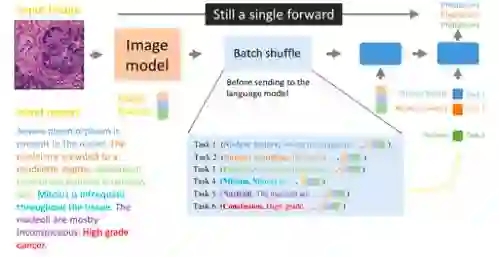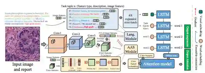 因为医学诊断报告比较长并且表述了多个图像特征,我们将整个报告的拟合转化为多个特征描述句的并行拟合(用 Batch shuffle 在训练时完成),即让一个 LSTM 前馈只专注于一种特征描述。