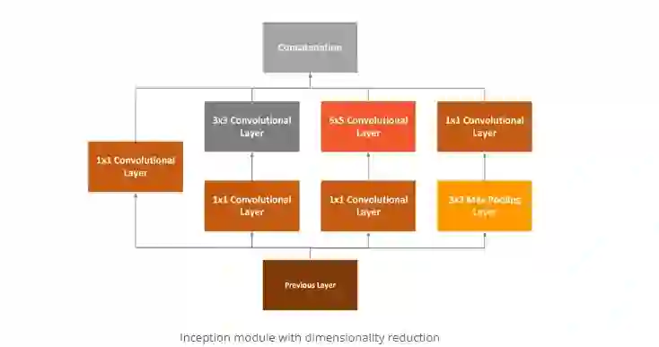GoogLeNet也称为Inception。这是因为它利用了两个概念:1×1卷积和初始模块。第一个概念1×1卷积用作降维模块。通过减少维数,计算量也会减少,这意味着可以增加网络的深度和宽度。GoogLeNet并未使用每个卷积层的固定大小,而是使用了Inception模块: