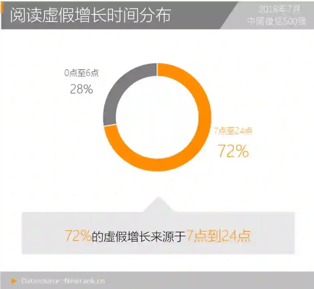 新榜基于历史获取的分钟监测数据绘制了阅读数据增长模型,根据模型去拟合出每篇异常内容的真实阅读数。观察可知在这些异常样本的阅读数中有52%为虚假增长,即每100个阅读数中,仅48个是有效阅读数。(以上数据基于拟合模型计算而得,仅供参考)