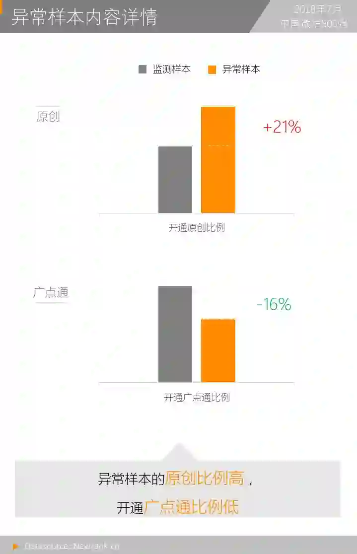 在1176个监测样本中,新榜初步观察到77个有数据造假嫌疑的公众号,之后又对嫌疑公众号进行二次验证,最终锁定42个异常公众号,占监测样本的3.6%。这说明,公众号数据造假相对占比较小。