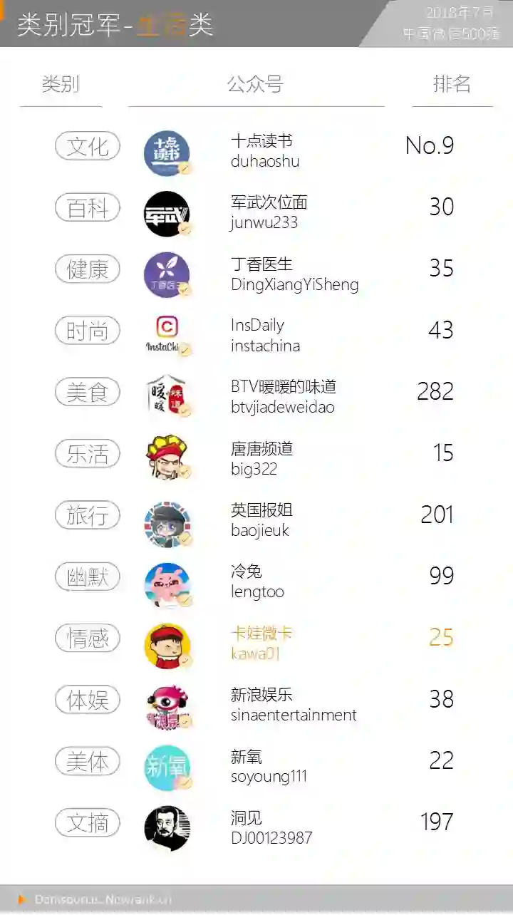 1.作为中国移动互联网内容价值标准构筑者,新榜坚信,没有内容分类的排行榜是没有比照意义的,是缺乏对内容价值深入理解能力的表现。因此,在需要打破内容类别、实施跨界对比的月榜中,新榜特意引入类别权重(具体系数可在新榜网站newrank.cn上查询),尽可能呈现一个符合社会主流价值的中国微信500强生态面貌。