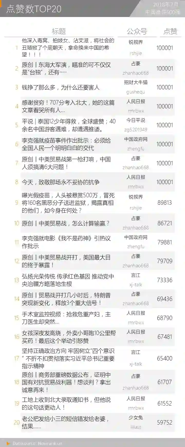 本月点赞十万加的内容共计8篇,“占豪”和“人民日报”各占2篇;另外“锐视界”的《他深入毒窝、拍妓女、沾艾滋,将社会的丑陋掀了个底朝天,拿命换来中国的希望!!!》,“招财大牛猫”的《钱挣了那么多,为什么还要害人》,“今日平说”的《平说| 泰国12少年得救,全球盛赞;40余名中国游客遇难,却遭遇推诿。》,“中国政府网”的《李克强就疫苗事件作出批示:必须给全国人民一个明明白白的交代》均获赞十万加。
