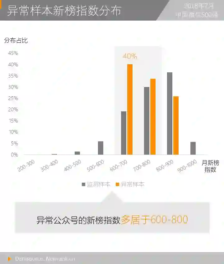 对异常样本的新榜指数进行统计,发现异常公众号集中在新榜指数600-900之间,且位于600-700区间内的公众号占比最大为40%。