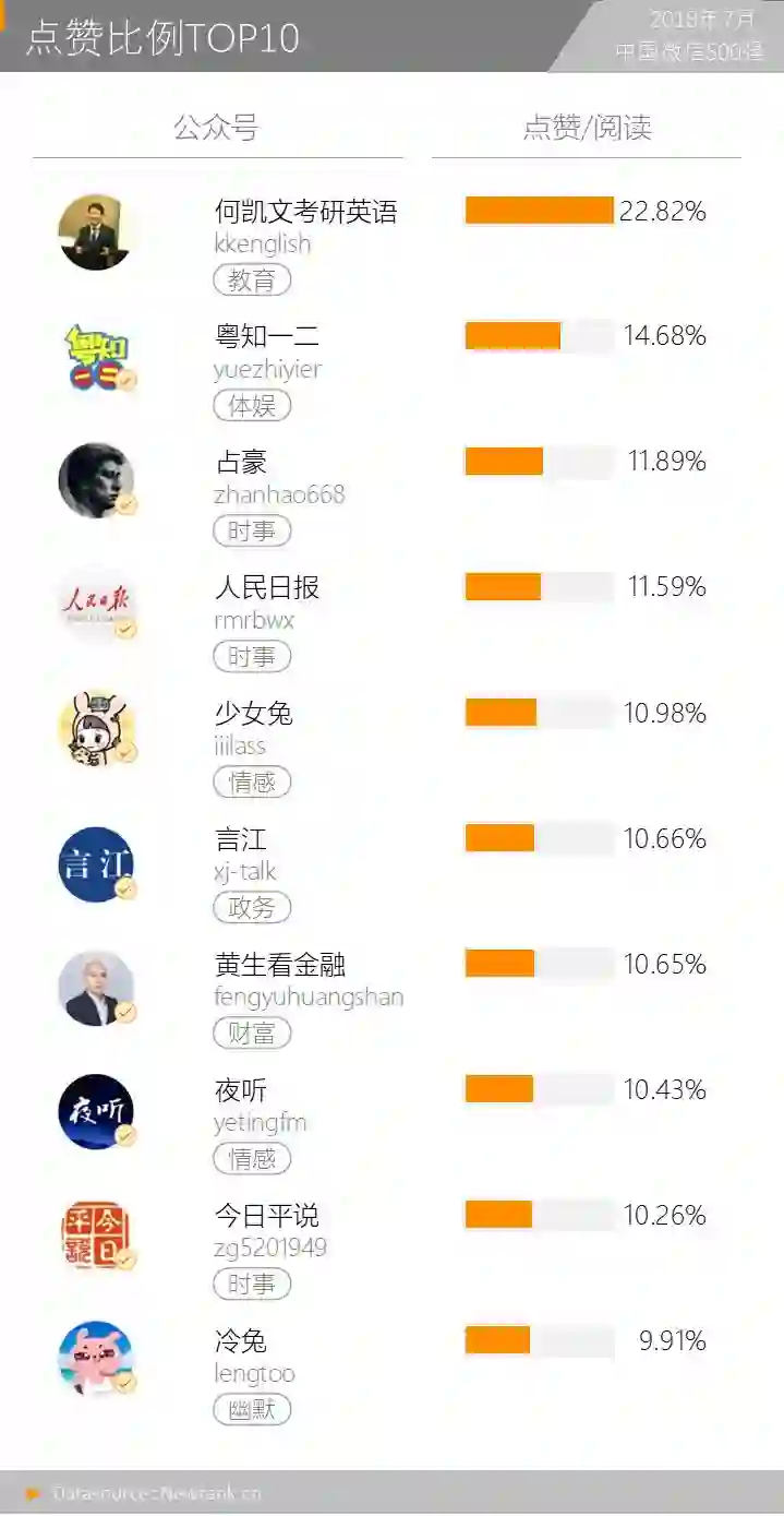 上月降至第二位的“夜听”,本月点赞比例持续下降4.3%,至10.4%,下滑至第八位;“何凯文考研英语”环比上升3.8%,稳居冠军。政务类账号“言江”,上月点赞比例仅为4%,本月上浮至10.7%,跃升点赞比第6位。
