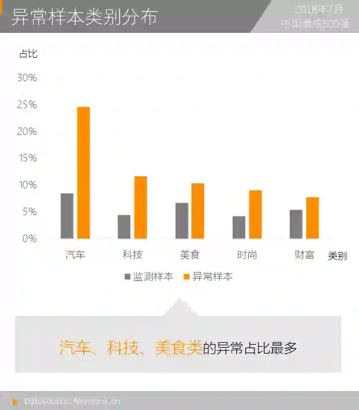 阅读数异常比例约占统计样本的3.6%,大多分布在新榜指数600-900区间,其中汽车、科技及美食类公众号异常比例较高。