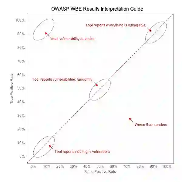 考虑到如果一个工具将每一行代码都标记为漏洞,则检测结果将会是100%的误报并且是没有价值的。如果该工具没有标记一个漏洞,则误报率为0,但是它也没有报出任何一个真实的漏洞,这也是没有价值的。如果一个工具随机报告每个测试是否包含漏洞,则将具有50%的真实漏洞,和50%的误报。