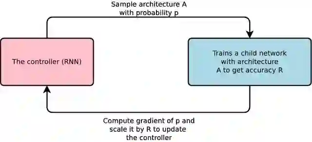 左边有一个名为「控制器」(the controller)的 RNN,它设计出一个「child」的模型架构(雷锋网觉得可以称之为「雏形/子架构」),而后者能够通过某些特定任务进行训练与评估。随后,反馈的结果(feedback)得以返回到控制器中,并在下一次循环中提升它的训练设定。这一过程重复上千次——生成新的架构、测试、再把反馈输送给控制器再次学习。最终,控制器会倾向于设计那些在数据集中能获得更高准确性的架构,而反之亦然。