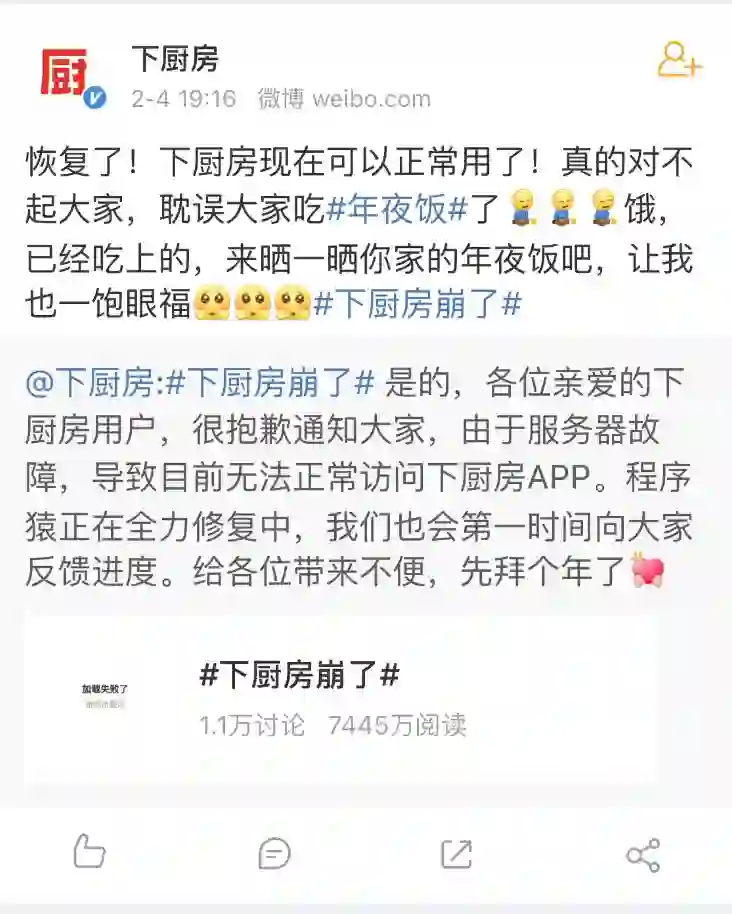 但在今天下午,备受吃货们依赖的美食菜谱App@下厨房 突然崩了,场面一度十分混乱……