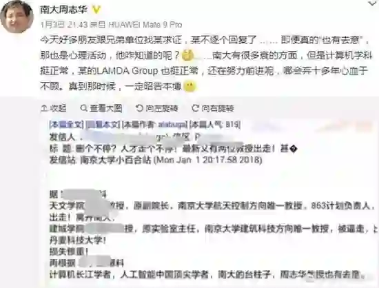 1月3日,国内人工智能领域的顶尖学者、南京大学计算机与科学技术系教授周志华通过个人实名认证微博就“出走传闻”做出回应。