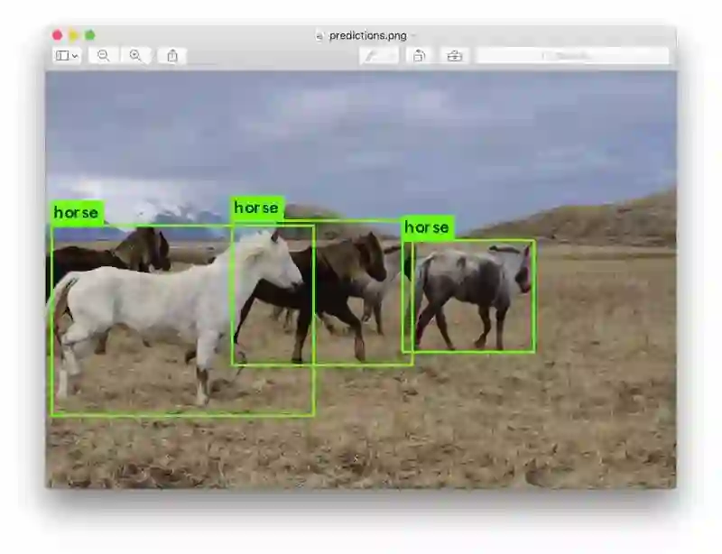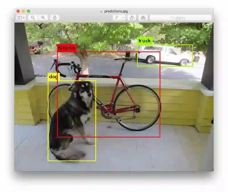 Darknet 会输出检测到的物体、自信度以及检测时间。我们没有用 OpenCV 编译 Darknet,所以它不能直接显示检测情况。检测情况保存在 predictions.png 中。大家可以打开这个图片来查看检测到的对象。我们在 CPU 上使用 Darknet,检测每张图片大约需要 6-12 秒,如果使用 GPU 将快得多。