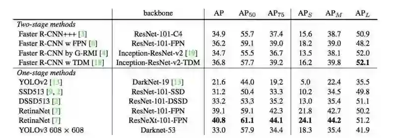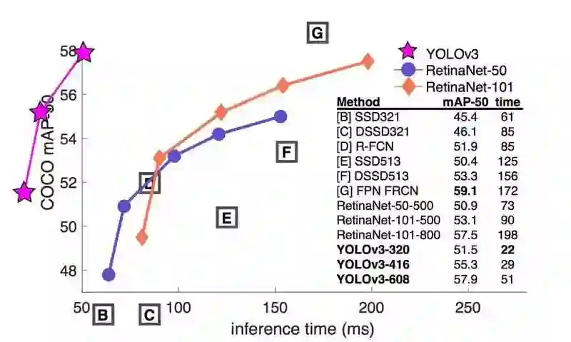 表 3 从表中可以看出,YOLOv3 表现得不错。RetinaNet 需要大约 3.8 倍的时间来处理一张图像,YOLOv3 相比 SSD 变体要好得多,并在 AP_50 指标上和当前最佳模型有得一拼。
