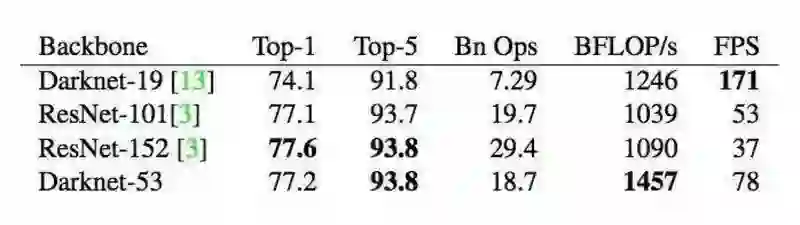新网络远比 Darknet-19 更强大,而且比 resnet-101 和 resnet-152 更有效。
