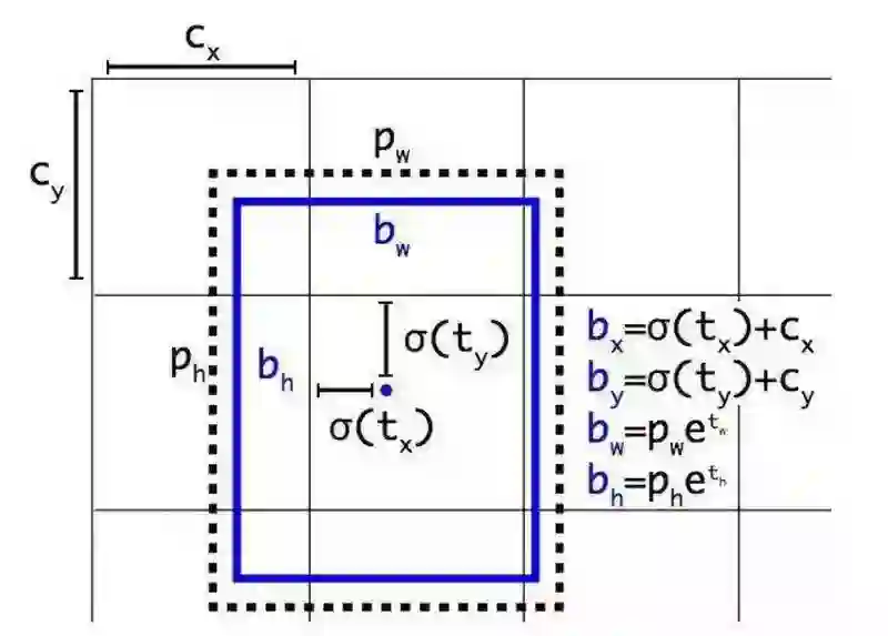 图 1 带有维度先验和定位预测的边界框。通过预测离聚类中心的偏移度来预测边界框的宽和高,并使用 Sigmoid 函数预测边界框相对于滤波器应用位置的中心坐标。