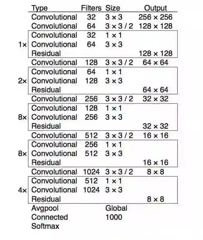 作者使用了新的网络进行特征提取,新网络是 Darknet-19 和残差网络的混合体。网络使用连续的 3×3 和 1×1 卷积层,但是加入了快捷连接。由于网络有 53 层卷积层,所以作者将新网络称作 Darknet-53。