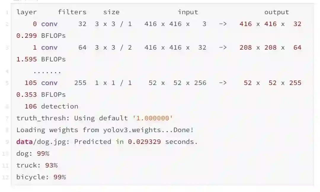 在命令行不给出图像信息的话就可以连续运行多个图片。当加载完配置和权重,你将看到如下提示: