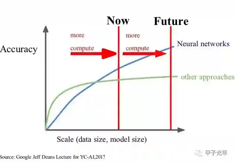 其次,在现有的主流“有监督学习”的算法模型下,为了让算法有更高的准确率,数据不嫌多。Google的技术大牛Jeff Dean曾在一次公开课上展示一个海量数据的训练结果,如下图所示:横轴代表数据规模,纵轴代表准确率,蓝线是深度神经网络算法,绿线是传统训练方法。