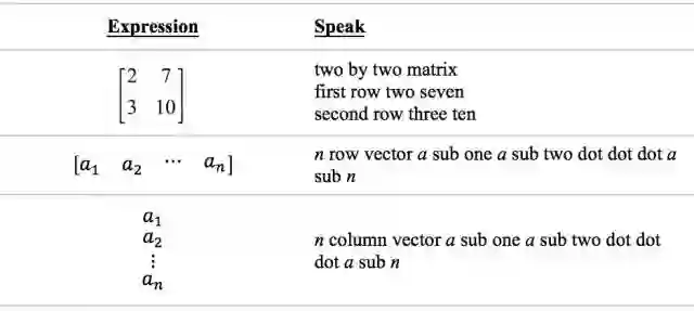 表里第一个是个矩阵,有四个元素,第一行是2 和 7, 第二行是3和10,用英文读时也和中文表达类似。