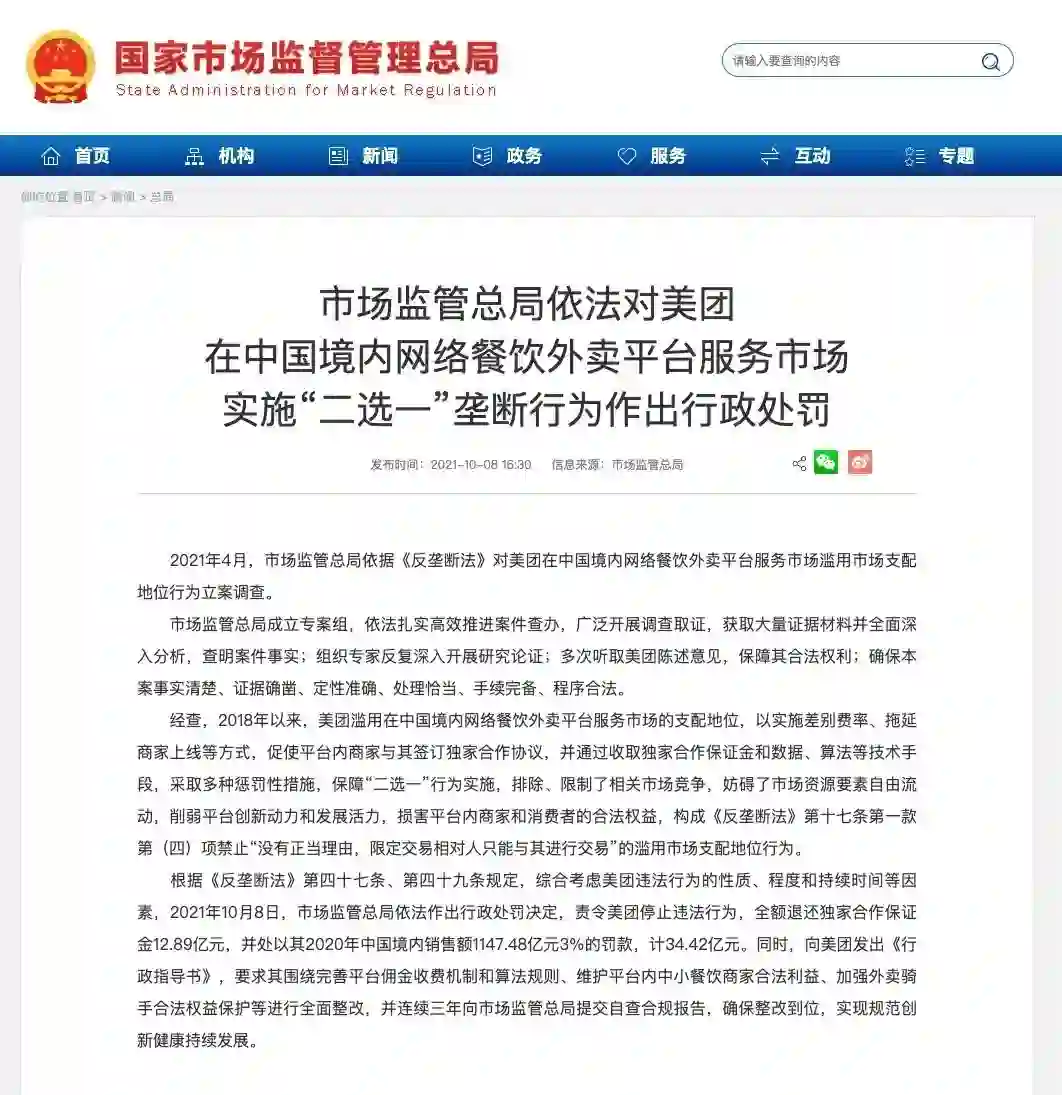 今日,国家市场监督管理总局发布文件,对美团在中国境内网络餐饮外卖平台服务市场实施“二选一”的垄断行为作出行政处罚,责令美团停止违法行为,全额退还独家保证金 12.89 亿元,并且需缴纳 2020 年中国境内销售额 1147.48 亿元 3% 的罚款,共计 34.42 亿元。同时向美团发出行政指导书,要求进行全面整改,三年内连续提交自查合规报告。