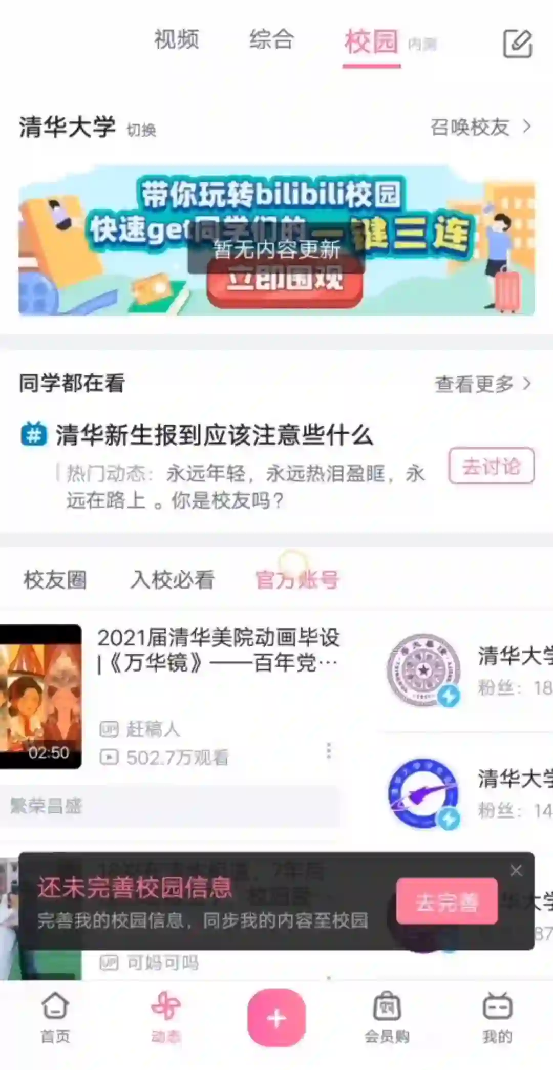 10 月 6 日,有部分 B 站网友发现哔哩哔哩推送了一个内测功能——校园,此功能可以添加用户的校园,可以随意进入其他校园无需审核。添加以后可以查看所在学校的“校友圈”“入校必看”“官方账号”等内容,还可以看到校园同学发布的动态,学校公示信息等。此外 B 站还推出了“同城”功能,可展示同城信息流内容。