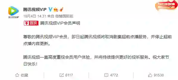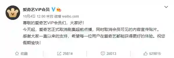 10 月 4 日,爱奇艺 、腾讯视频 、优酷视频三大视频平台官宣取消剧集超前点播服务,并停止超前点播内容更新。此前已有不少网友对于视频平台 VIP 会员服务和超前点播机制表示不满,9 月中消协还发文呼吁少些套路,多些真诚,视频平台 VIP 服务应依法合规、质价相符