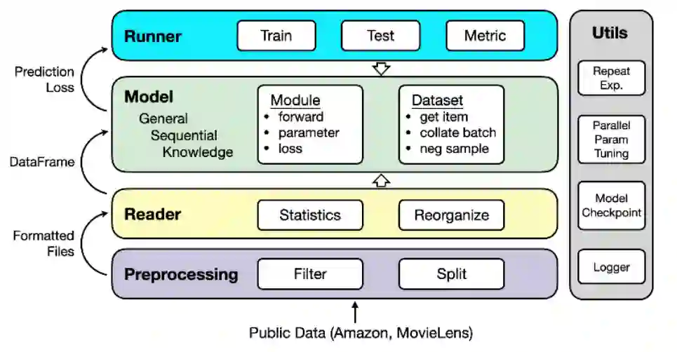 (2) 轻量实用. ReChorus 框架力求简洁,核心代码在 1000 行左右,非常易于理解与上手.框架整体基于PyTorch 实现,契合如今研究社群中深度学习框架使用的整体趋势.此外,为了方便研究者迭代更新模型,ReChorus 将模型独特的部分集中在一个文件中,使得开发与测试过程更加高效.我们还针对研究者引入了许多实用的功能,比如中间变量检查、重复实验记录、并行参数搜索等.