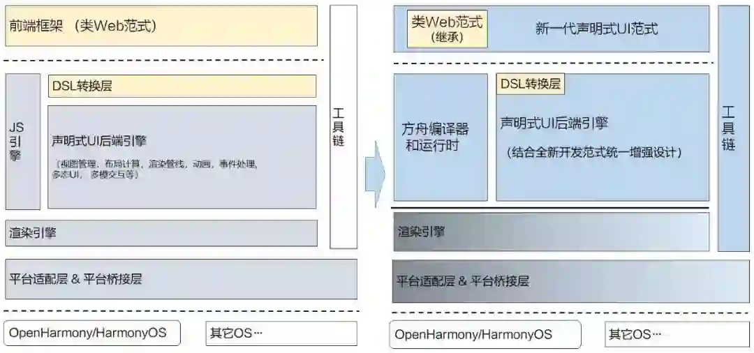 另外,在 ArkUI 3.0 框架中,类 Web 范式会继续保留,即类 Web 范式和新一代的声明式 UI 范式都可以支持,可以各自独立使用,但不能混用。