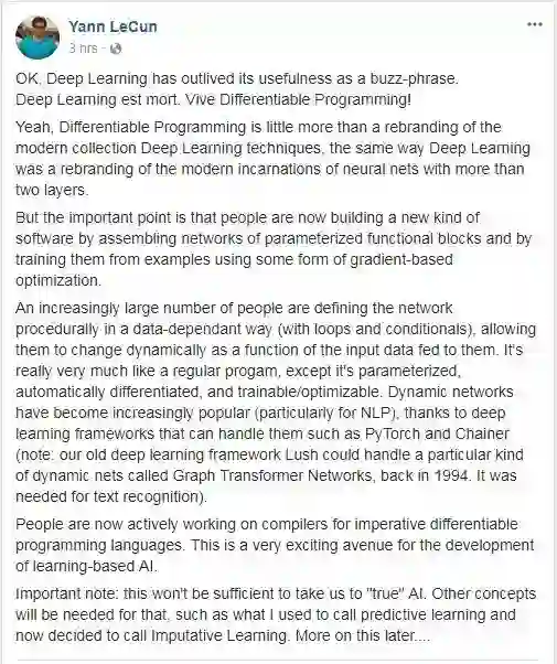 昨天,Yann LeCun在Facebook个人主页上写到:深度学习已死,可微分编程万岁! 这让不少人大吃一惊,莫非我们一直坚信的深度学习技术是假的“炒作概念”?