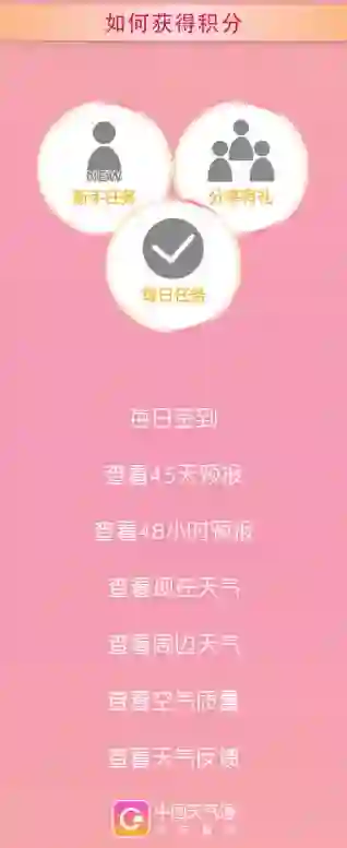 由中国气象局官方推出的APP中国天气通近日更新了带有用户系统的全新版本,用户注册后,每天可通过完成各种有趣的任务,获取积分。