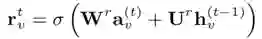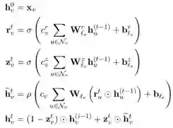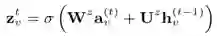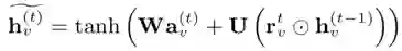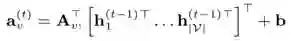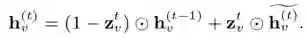 节点的state embedding h_{v^(t-1)},与其他节点的交互信息a_{v^(t)}通过GRU单元进行融合: