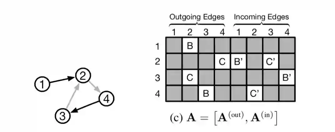 将图矩阵作如下表示,不同类型的边采用不同类型的传播矩阵,同时,用 A^(out)和 A^(in) 分别表示节点的入度信息和出度信息。