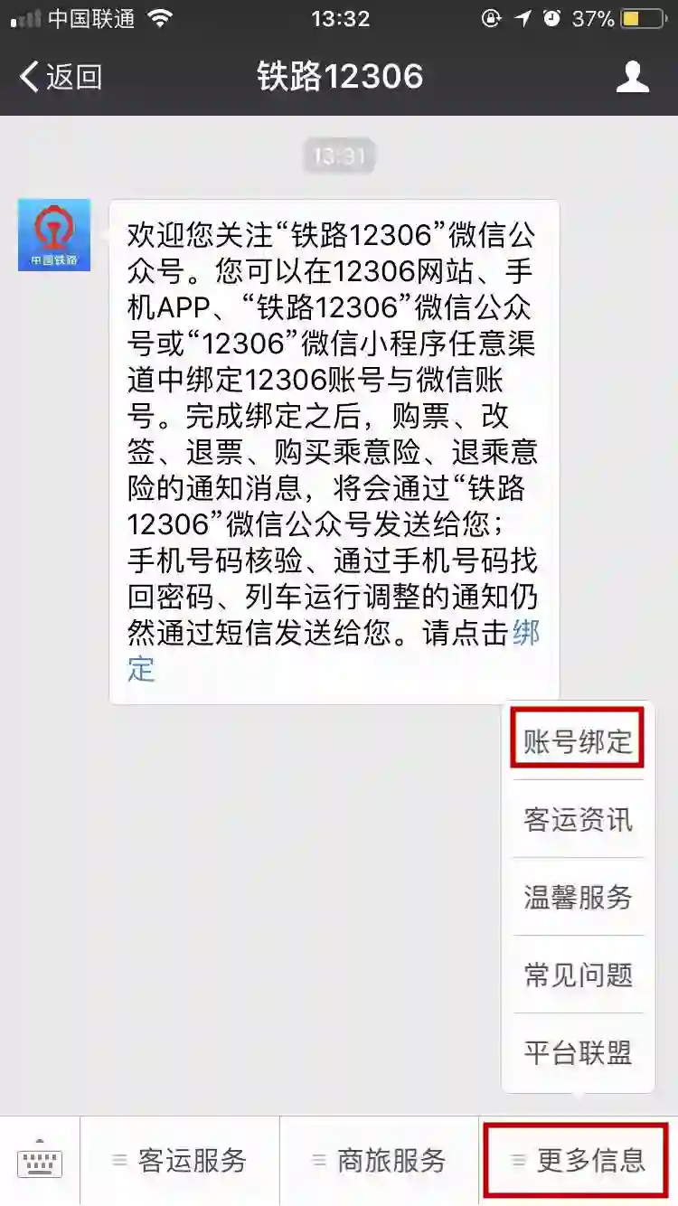 Step1:关注“铁路12306”微信公众号,点击自定义菜单“更多信息”——“账号绑定”,进入账号绑定页面;
