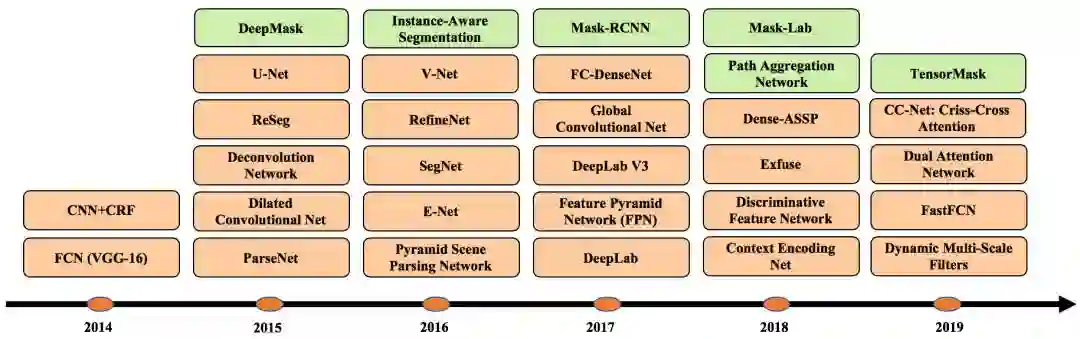 基于深度学习的二维图像分割算法的时间轴。橙色块表示语义块,绿色块表示实例块。