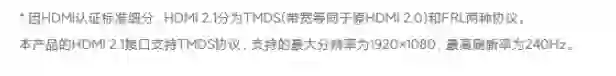 “因 HDMI 认证标准细分,HDMl 2.1 分为 TMDS(带宽等同于原 HDMI 2.0)和 FRL 两种协议。本产品的 HDMl 2.1 接口支持 TMDS 协议,支持的最大分辨率为 1920×1080,最高刷新率为 240Hz。”