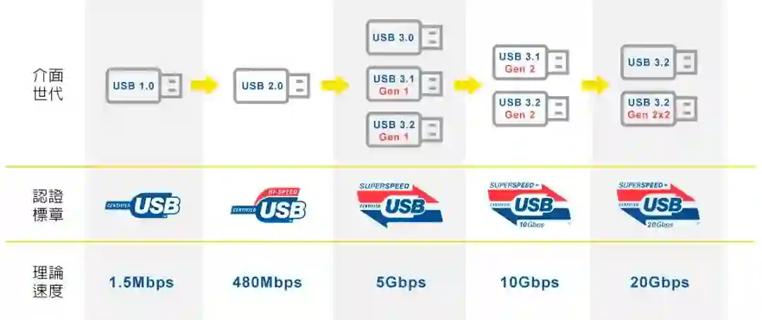 2019 年,USB 3 规范统一归入 USB 3.2,最新的 USB 3.2 叫 USB 3.2 Gen 2x2,原 USB 3.1 改称 USB 3.2 Gen 2、原 USB 3.0 改叫 USB 3.2 Gen 1。