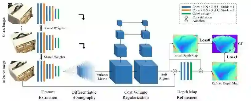 图1 MVSNet的网络设计。输入图像经过二维特征提取网络和可微单应变换生成代价体。最终的深度图输出从正则化的概率体中回归,并使用参考图像进行细化