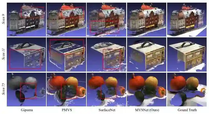 图4 DTU数据集scan9、11、75的定性结果。我们的MVSNet生成了最完整的点云,特别是在那些没有文本和反射的区域。