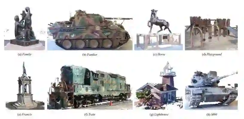 图5 坦克和寺庙数据集 intermediate set 的点云结果,证明了MVSNet在复杂户外场景下的泛化能力