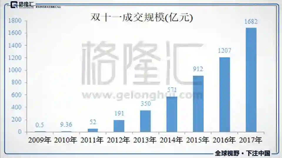 张勇在马云面前站稳了脚跟,属于天猫的狂欢时代也开始了。双十一的爆发速度令人瞠目,从2009年的0.5亿到2017年的1682亿,9年时间增长3000多倍。