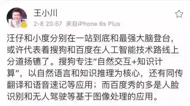 现在,王小川已经成长为李彦宏最强大的对手。在内部信中,王小川这么描述两者的关系:在搜索之外,我们两年前便开始了面向未来的布局。依赖于搜狗的积极布局,再加上竞争对手的战略迷失,我们在人工智能、大数据和IOT领域,都追赶到同一起跑线,甚至赢得先机。