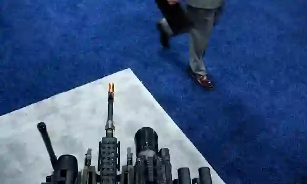 一名男子在武器交易会上走过武装机器人系统。摄影:Brendan Smialowski/ Bloomberg /Getty Images