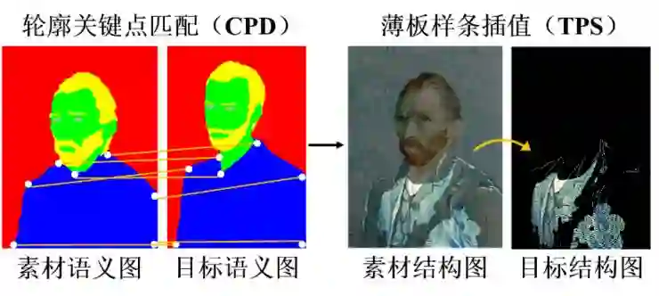 图 4:首先根据 CPD 算法对素材语义图和目标语义图进行轮廓关键点匹配,之后依据匹配结果,利用薄板样条插值算法将素材风格图中的具备显著结构信息的像素点映射到新图像中,该图像定义为目标结构图。